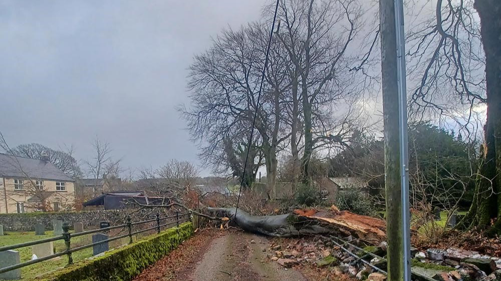 Tree cutting teams are clearing trees from lines before engineers and overhead lines teams can rebuild sections of network where poles have snapped and lines have been brought down. Electricity North West has warned that a small number of customers may be without power until Wednesday given the ongoing winds and challenging repairs.