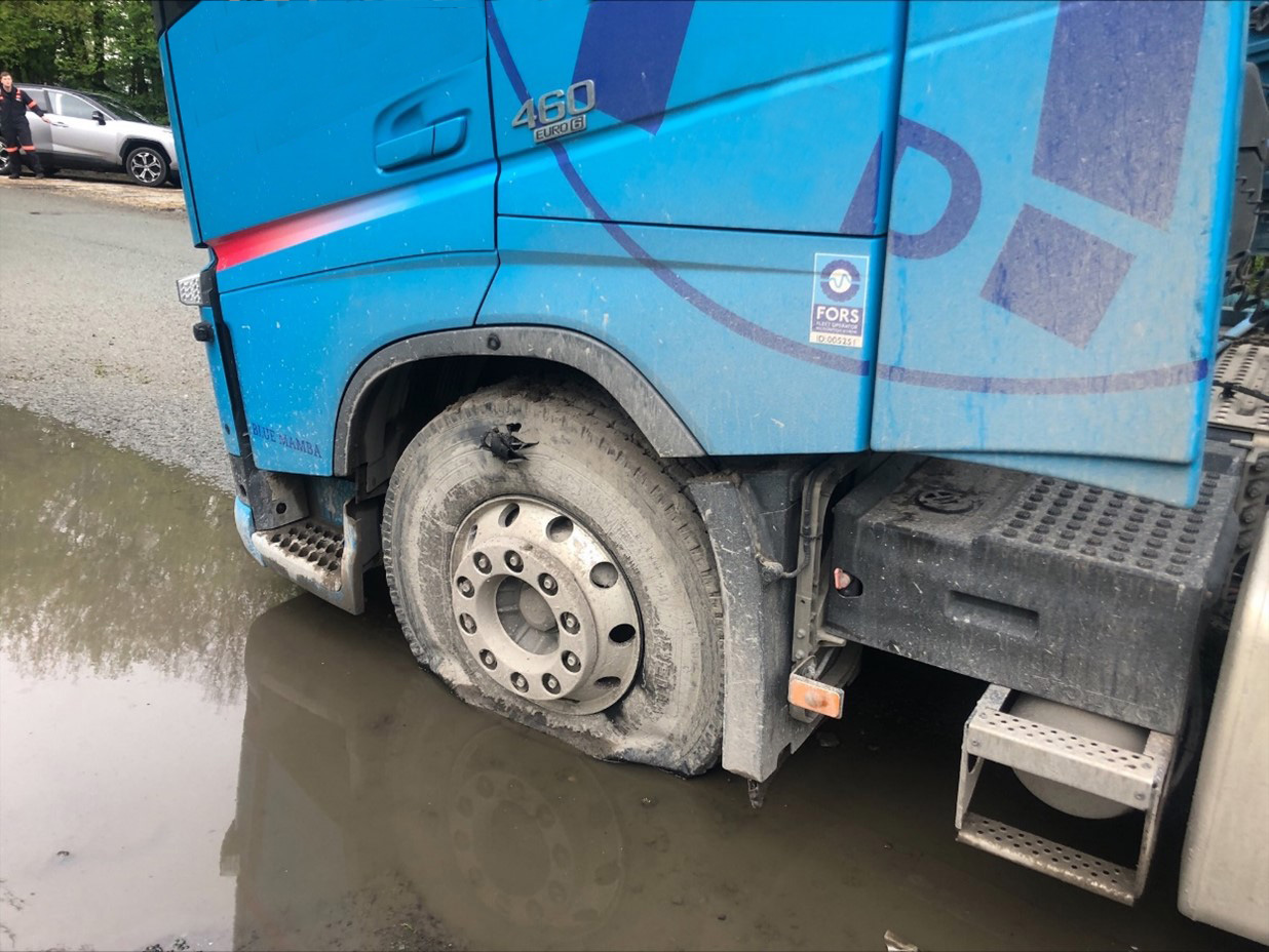 “Luckily, we’re only dealing with three burst tyres and a power cut, but this could have been far worse. The driver is lucky to be alive.